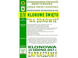 Klonowa już po raz XIV zaprasza na festyn dożynkowy pod hasłem "Na zdrowie". Impreza jest zorganizowana przez Stowarzyszenie Przyjaciół Gminy Klonowa oraz Urząd Gminy.