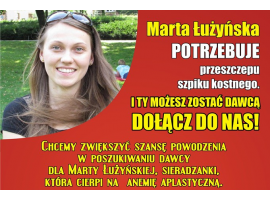 W niedzielę, 10 stycznia, będzie kolejna akcja, na której będzie można zapisać się do banku dawców szpiku kostnego. Zbiórka ma zwiększyć szansę znalezienia dawcy dla Marty Łużyńskiej, sieradzanki cierpiącej na anemię aplastyczną.