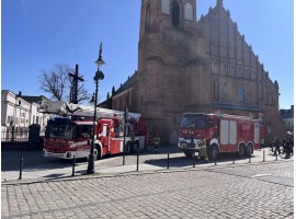 Strażacy z Jednostki Ratowniczo - Gaśniczej Państwowej Straży Pożarnej w Sieradzu na kolejnych ćwiczeniach. Tym razem manewry pożarnicze odbywają się w kolejnych dniach przy Bazylice Mniejszej.