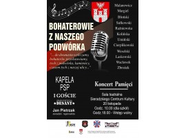 Zapraszamy dziś na muzyczno-poetycką podróż pn. "Bohaterowie z naszego podwórka". W trakcie koncertu poznacie lub przypomnicie sobie ludzi, którzy swoją odwagą zapisali się w historii Sieradza i okolic. Początek o godz. 18.00 w sali teatralnej Sieradzkiego Centrum Kultury. Wstęp wolny.