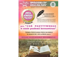 Spółdzielczy Dom Kultury w Sieradzu zachęca do wzięcia udziału w konkursie poetyckim pn. "Coś pozytywnego w czasie pandemii koronawirusa". Konkurs jest skierowany do młodzieży i dorosłych. Termin przesyłania poezji został przedłużony do 25 maja.