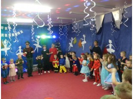 Kolorowe stroje, zimowy wystrój "sali balowej", głośna, skoczna muzyka- w takiej atmosferze bawiły się dzieci z Przedszkola nr 6 z Oddziałami Integracyjnymi im. Jasia i Małgosi w Sieradzu podczas swojego Balu Karnawałowego.