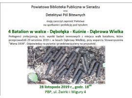 28 listopada 2019 r. o godz. 18 Sieradzcy Detektywi Pól Bitewnych zrelacjonują m.in. wyniki badań terenowych z miejsca walk batalionu, które przeprowadzili 29 września 2019 r. w lasach Dąbrowy Wielkiej, przy wsparciu Stowarzyszenia "Wizna 1939". Odpowiedzą na pytania i przedstawią plany na przyszłość.