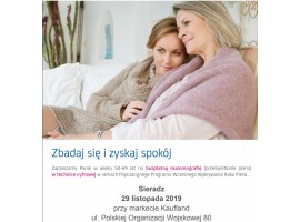 W piątek, 29 listopada, przy markecie Kaufland w Sieradzu będzie można wykonać badania mammograficzne. Skierowane są dla kobiet w wieku 50-69 lat. Badania wykonywane są w ramach Programu Profilaktyki Raka Piersi finansowanego przez NFZ.