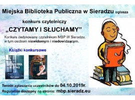 Miejska Biblioteka Publiczna w Sieradzu zaprasza do wzięcia udziału w konkursie czytelniczym "Czytamy i słuchamy". Przeznaczony jest dla czytelników MBP w Sieradzu, w tym osób niewidomych i niedowidzących, działających w sieradzkim oddziale Polskiego Związku Niewidomych.