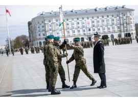 Honorowy proporzec "Przodującego Pododdziału Dowództwa Garnizonu Warszawa" został wręczony żołnierzom 15 Sieradzkiej Brygady Wsparcia Dowodzenia podczas uroczystości z okazji Święta DGW.