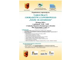 28 lutego w sali C Starostwa Powiatowego rozpoczną się Targi Pracy i Doradztwa Zawodowego, w tym roku będzie im przewodziło hasło "Ścieżki do zatrudnienia". Organizatorzy chcą umożliwić pracodawcom bezpośredni kontakt z jak najliczniejszą grupą potencjalnych pracowników, jednym z celów jest prezentacja ofert pracy oraz oczekiwań pracodawców jak najszerszej grupie osób, które jej poszukują.