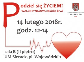 Młodzieżowa Rada Miejska w Sieradzu oraz Regionalne Centrum Krwiodawstwa i Krwiolecznictwa w Łodzi punkt pobrań w Sieradzu zapraszają na walentynkową zbiórkę krwi.