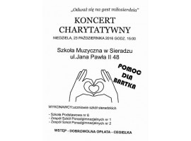 W najbliższą niedzielę (23 października) w Szkole Muzycznej w Sieradzu odbędzie się koncert charytatywny w wykonaniu uczniów sieradzkich szkół. Zebrana kwota zostanie przeznaczona na chorego na nowotwór Bartosza.