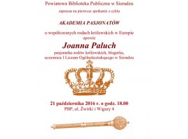 Pierwsze spotkanie z cyklu Akademia Pasjonatów odbędzie się 21 października. Cykl rozpocznie Joanna Paluch, uczennica I Liceum Ogólnokształcącego w Sieradzu, która jest pasjonatką rodów królewskich.