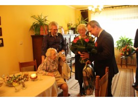Z tej okazji nie zabrakło wielu serdecznych życzeń, kwiatów, tortu urodzinowego, toastu oraz prezentów, które wręczył jubilatce m.in. wiceprezydent Sieradza Rafał Matysiak.