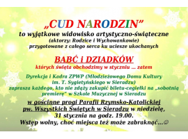Zespół Placówek Wychowania Pozaszkolnego organizuje spektakl "Cud narodzin" z okazji dnia babci i dziadka. Widowisko artystyczne będzie poświęcone tematyce świątecznej.