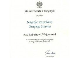 Wyjątkowe wyróżnienie spotkało głównego szkoleniowca a zarazem Prezesa Sieradzkiego Klubu Karate Kyokushinkai - Roberta Wajgelta. W uznaniu zasług w dziedzinie propagowania sportu, a szczególnie rozwoju sportów walki, został on uhonorowany przez Ministra Sportu i Turystyki Joannę Muchę Nagrodą Zespołową II Stopnia. Nagroda została przyznana za osiągnięcia sportowe sieradzkiego szkoleniowca w 2011 roku.