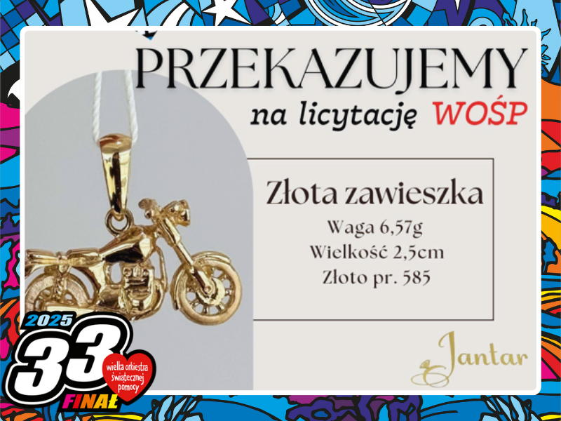 Złote Serduszko 33. Finał WOŚP 2025sprzedane Cena ostateczna: 2100 zł Wyjątkowe złote serduszko z okolicznościowym grawerem przygotowane specjalnie na 33. Finał WOŚP. To grawerowana dwustronnie złota zawieszka w kształcie serca, która doskonale oddaje charytatywny charakter aukcji WOŚP. Serduszko wyróżnia się pięknym połyskiem i unikatowym charakterem, dzięki połączeniu białego i żółtego złota na jednej stronie oraz okolicznościowemu grawerowi WOŚP 2025 na drugiej stronie. Diamentowanie nadaje mu dodatkowej elegancji i wyrafinowania. Całość została oprawiona w elegancką drewnianą ramę, która idealnie nadaje się zarówno do powieszenia na ścianie, jak i postawienia w widocznym miejscu. Dla osoby lub firmy, która wylicytuje serduszko, stanie się ono nie tylko piękną ozdobą, ale także symbolem zaangażowania i wsparcia niesienia pomocy. Przekazuje:Pracownia Złotniczo-Julbilerska M.J.Świniarscy |