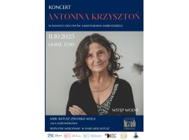 Antonina Krzysztoń polska pieśniarka, kompozytorka, autorka tekstów wystąpi w Miejskim Domu Kultury Ratusz. Koncert odbędzie się w ramach XXIX Dni Św. Maksymiliana Marii Kolbego.