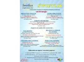 Świetlica "Świetlik" prowadzona przez Stowarzyszenie Rozwoju Kultury Dzieci i Młodzieży we współpracy z Powiatowym Młodzieżowym Domem Kultury "Na pięterku" w Zduńskiej Woli zaprasza na cykl zajęć dla dzieci, młodzieży oraz dorosłych zainteresowanych aktywnym i kreatywnym spędzaniem wolnego czasu.