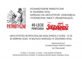 Stowarzyszenie Patriotyczne w Zduńskiej Woli zaprasza na uroczystość odsłonięcia i poświecenia tablicy upamiętniającej 40-lecie powstania NSZZ "Solidarność". To w najbliższą niedzielę - 30 sierpnia.