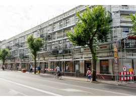 Jeszcze w tym roku kompleksowej termomodernizacji doczekają się kamienice przy ulicy Łaskiej 2 i 6. Prace już wystartowały. Przy jednym z budynków widać rusztowania.