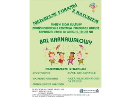 W ramach Niedzielnych Poranków z Ratuszem Miejski Dom Kultury zaprasza dzieci w wieku 0-10 lat i ich rodziców na BAL KARNAWAŁOWY. Zabawę zaplanowano na najbliższą niedzielę.
